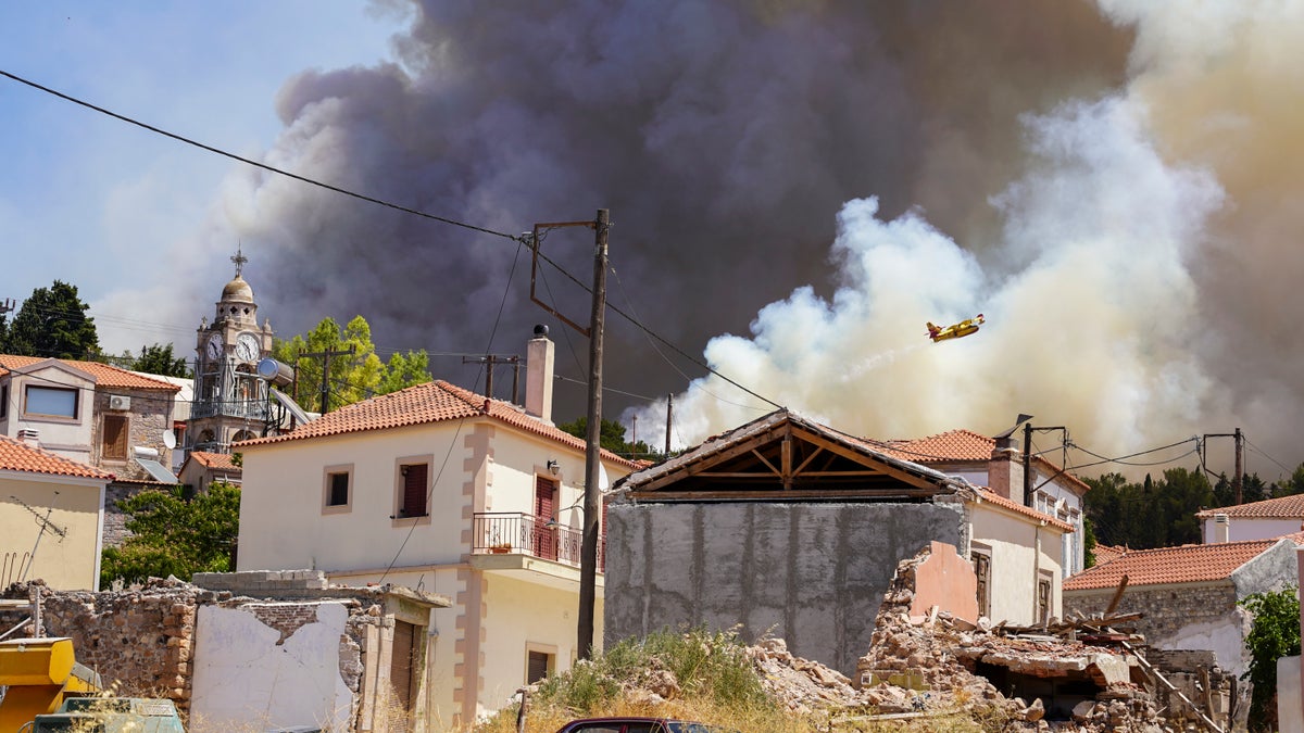 Api berkobar di samping rumah-rumah di kawasan Drafi timur Athena pada Rabu, 20 Juli 2022. Ratusan orang dievakuasi dari rumah mereka Selasa malam karena kebakaran hutan mengancam pinggiran pegunungan di timur laut Athena. Petugas pemadam kebakaran berjuang dan berjuang sepanjang malam untuk memadamkan api, yang diperburuk oleh hembusan angin kencang. (Foto AP/Thanasis Stavrakis)